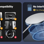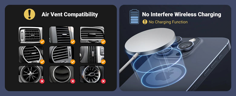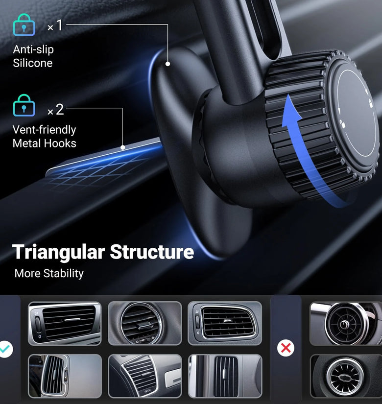 - Never Blocking Air Vent: The magnetic car phone holder is designed to avoid blocking airflow from your car's air vents. With its 360-degree swing arm and flexible angle adjustment, it allows optimal cool air circulation around your phone, preventing overheating from the car’s air conditioning system.