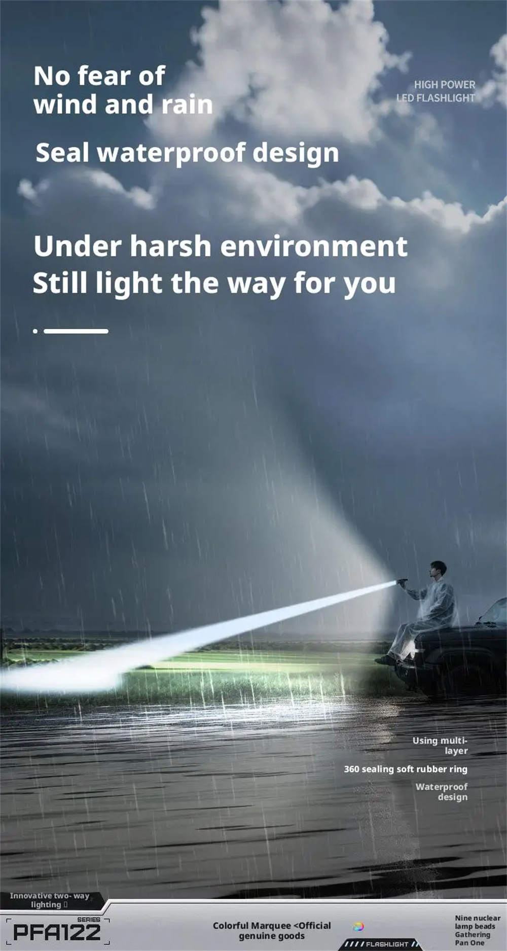 Equipped with a waterproof body, this flashlight can withstand splashes and light rain, making it suitable for various weather conditions.