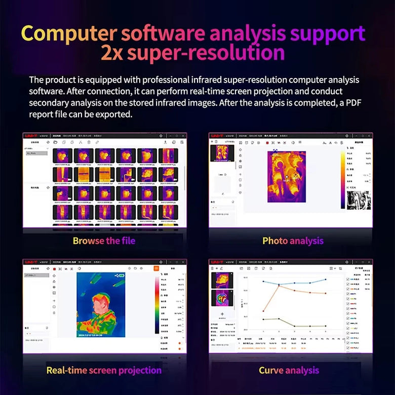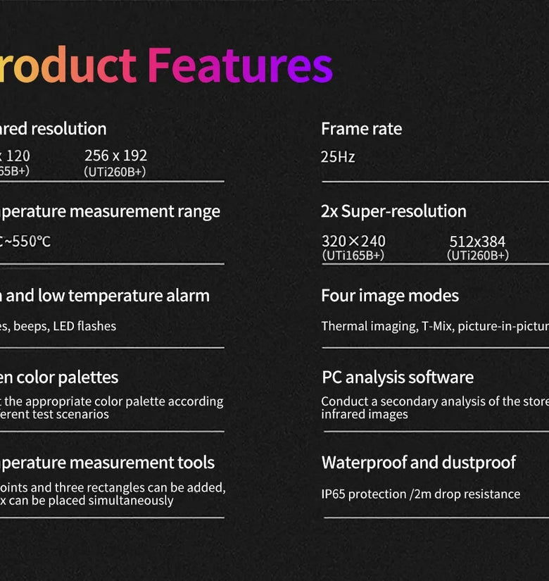 Supports infrared resolution up to 256 x 192 (UTi260B+) or 160 x 120 (UTi165B+), providing clear and accurate heat detection for a variety of inspection tasks.