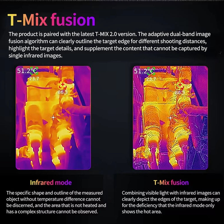 Offers four distinct modes: Thermal Imaging, T-Mix Dual-light Fusion, Picture-in-Picture, and Visible Light, delivering versatile solution for unique application needs.