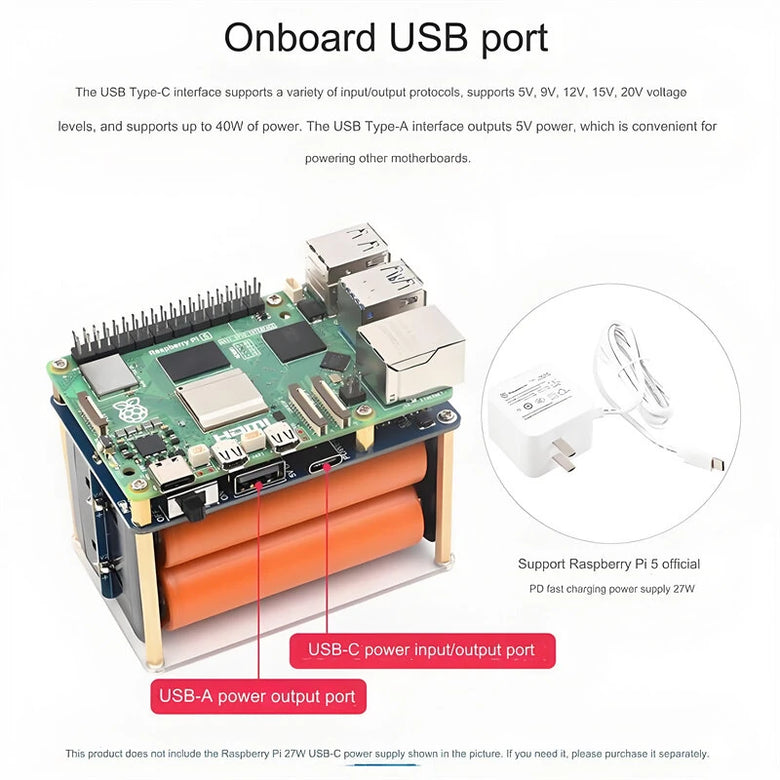1. Bidirectional Fast Charging: Equipped with a Type-C port that supports PD3.0 and other fast charging protocols, our UPS HAT offers a robust 40W power flow for both input and output. This ensures efficient power management and delivery for your Raspberry Pi 5/4B/3B+ systems.