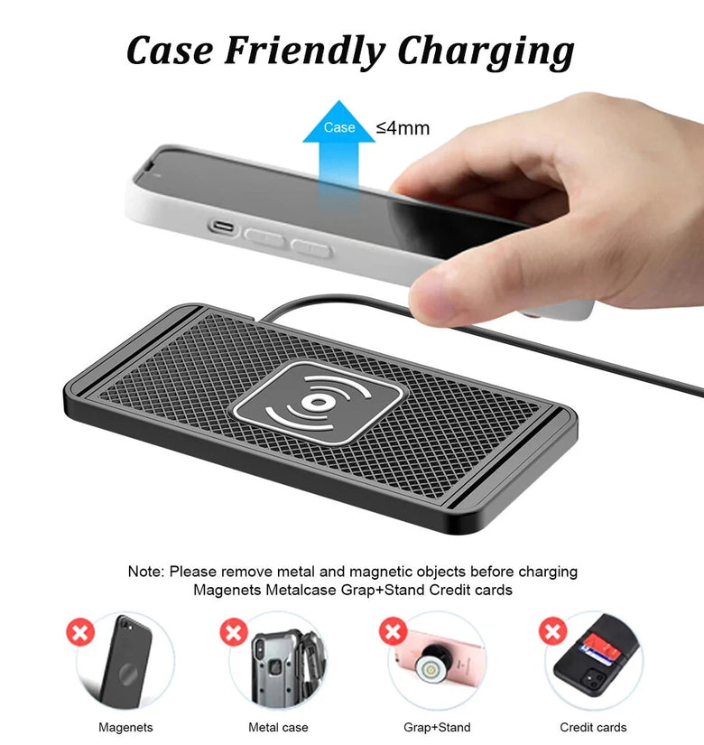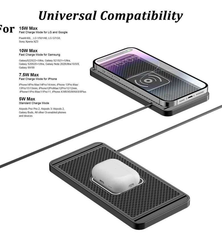 - Premium Material Construction: Made from high-quality silicone rubber, the car wireless charger is designed to be wear-resistant and slip-proof. The non-slip rubber base ensures your phone remains stable and prevents accidental falls during use, providing a reliable and secure charging experience.