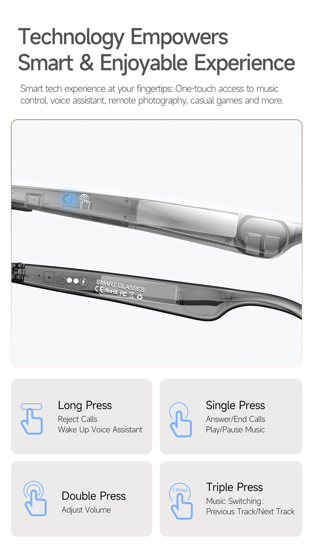 3. Hands-Free Smart Interaction: One-touch control for calls, music playback, voice assistant activation, and remote photography.