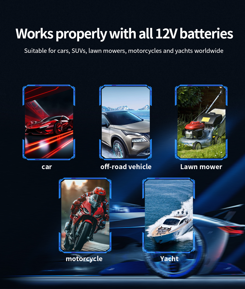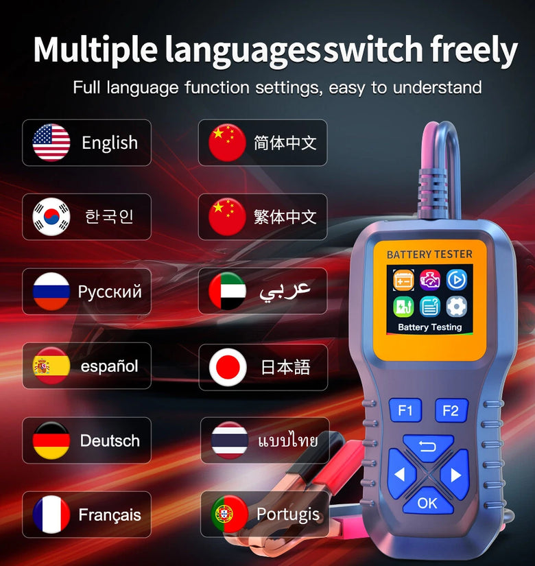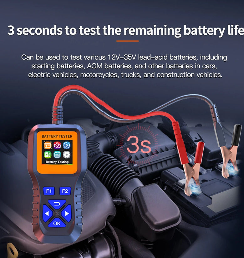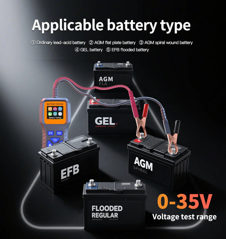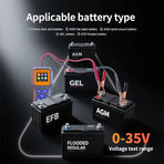 Supports testing lithium iron, polymer lithium, ternary lithium, lead-acid, AGM, GEL batteries (12V-35V). Ideal for cars, motorcycles, trucks, yachts, and lawn mowers.