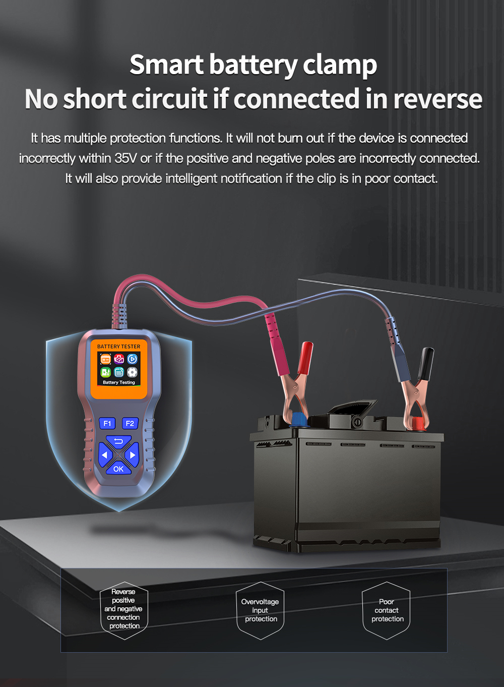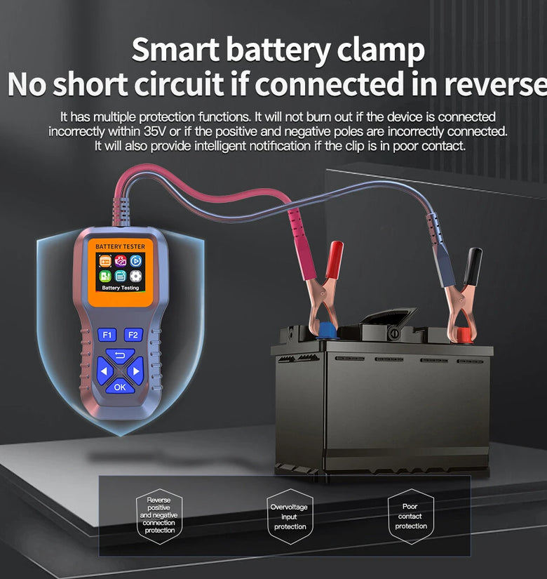 Reverse polarity protection, overvoltage prevention, and poor contact notifications assure the tester and battery. Ensure uncompromised professional performance.