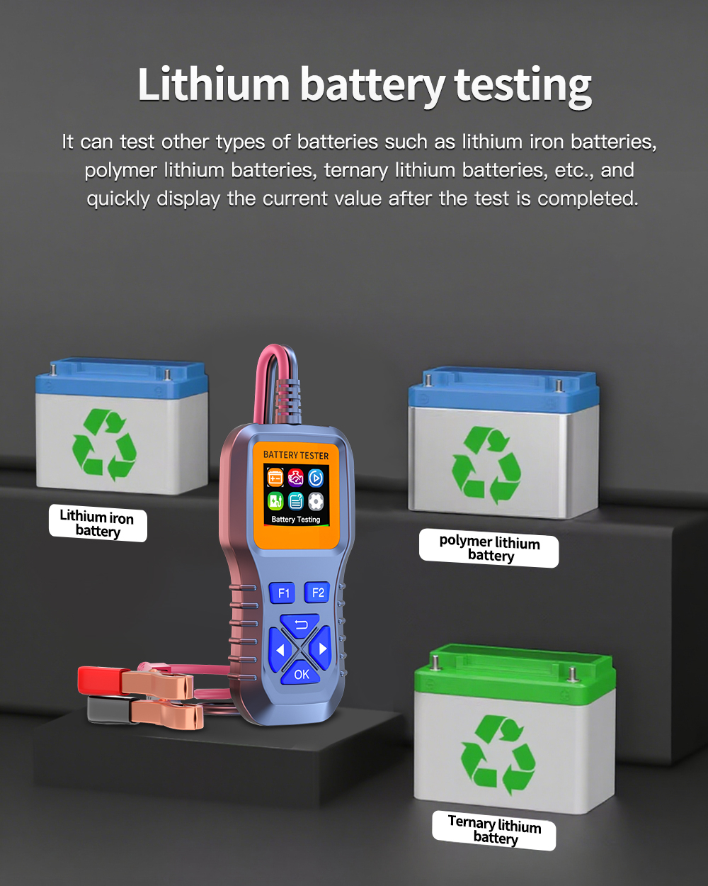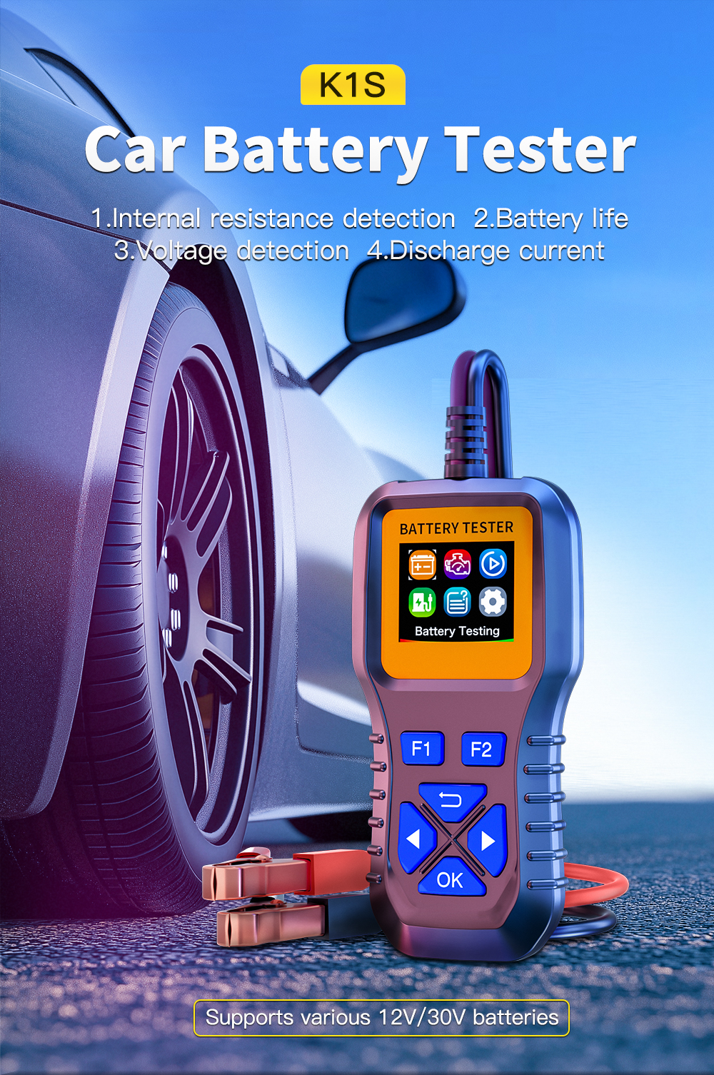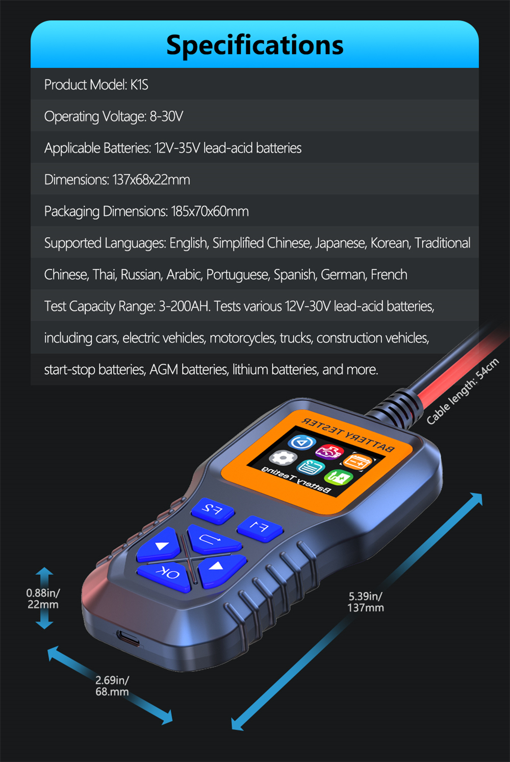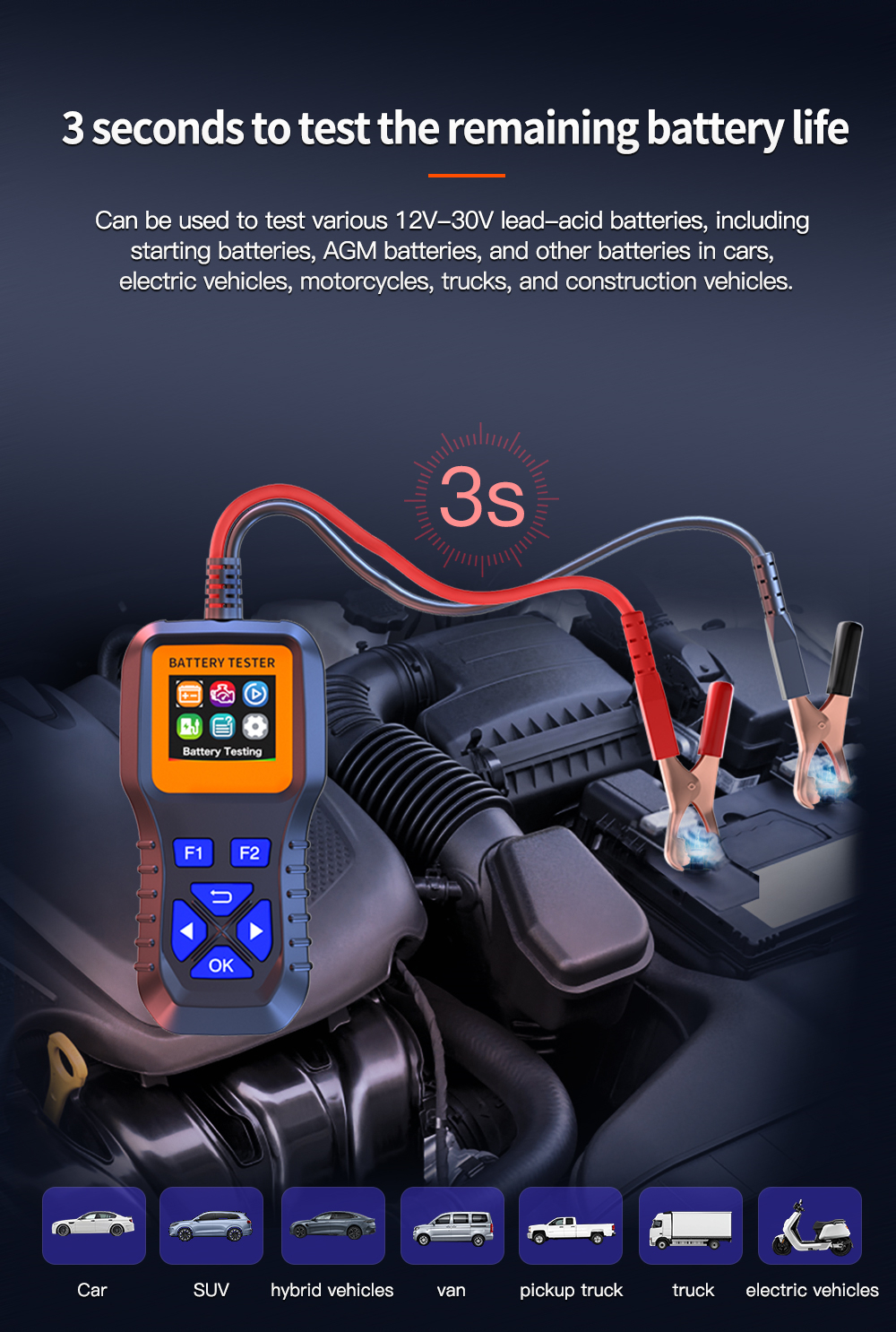 Test Capacity Range: 3-200AH. Tests various 12V-30V lead-acid batteries, including cars, electric vehicles, motorcycles, trucks, construction vehicles, start-stop batteries, AGM batteries, lithium batteries, and more.