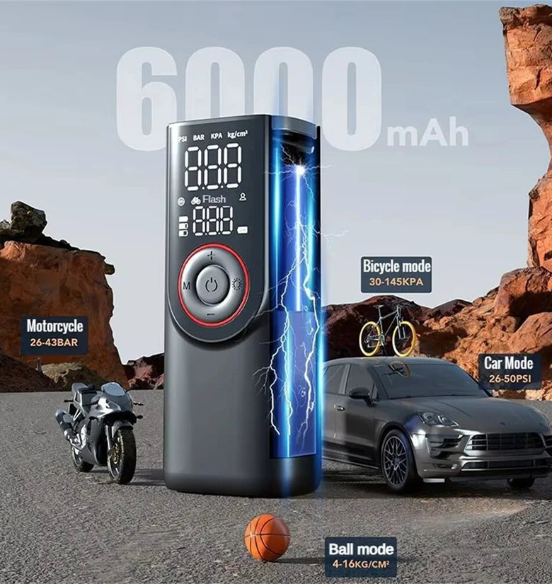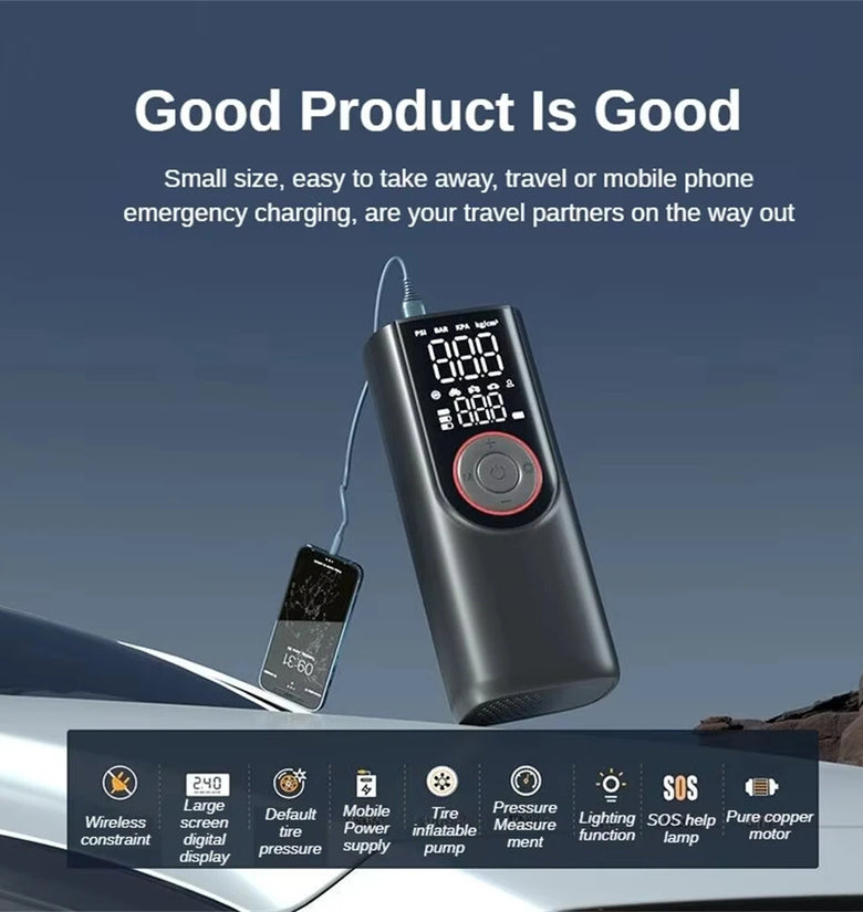 Functions: Inflation, Pressure Measurement, Auto Stop, Flashlight, SOS Emergency Mode, Power Bank