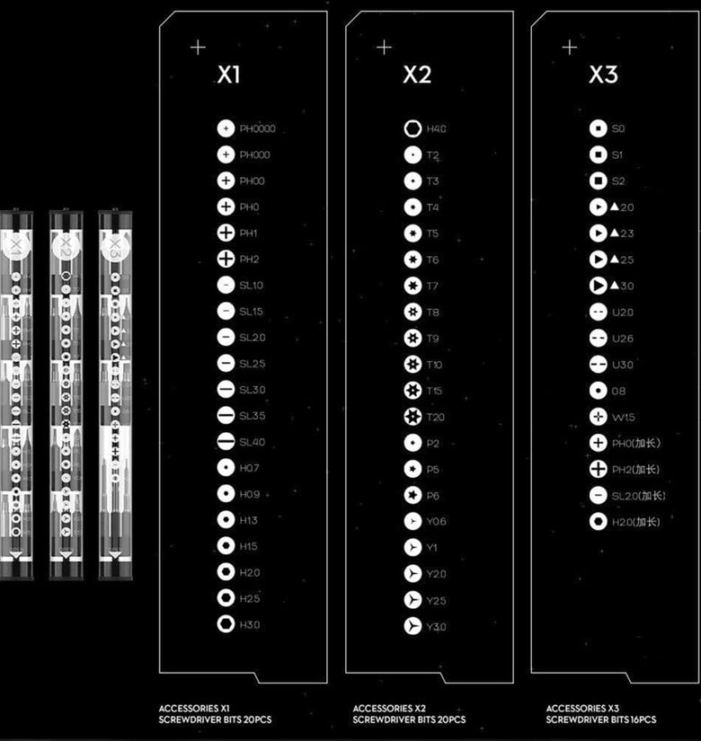 Tri-Angle: W15, P2/ P5/ P6, S0/ S1.0/ S2.0, U2.0/ U2.6/ U3.0, Y0.6/ Y1.0/ Y2.0/ Y2.5/ Y3.0, PH0000/ PH000/ PH00/ PH0/ PH1/ PH2, T2/ T3/ T4/ T5/ T6/ T7/ T8/ T9/ T10/ T15/ T20, H0.7/ H0.9/ H1.3/ H1.5/ H2.0/ H2.5/ H3.0/ H4.0, SL1.0/ SL1.5/ SL2.0/ SL2.5/ SL3.0/ SL3.5/ SL4.0, BisonFone0.8, Triangle: 2.0/ 2.3/ 2.5/ 3.0