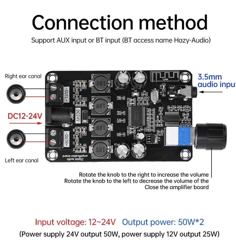 The input voltage is 12-24V, and the output power is 50W * 2 (50W * 2 when the input voltage is 24V, and 25W * 2 when the input voltage is 12V). The volume can be adjusted by turning the knob to the right to increase the volume, and to the left to decrease the volume until the power amplifier board is turned off. High definition BT 5.0 or AUX port audio input, dual channel output.