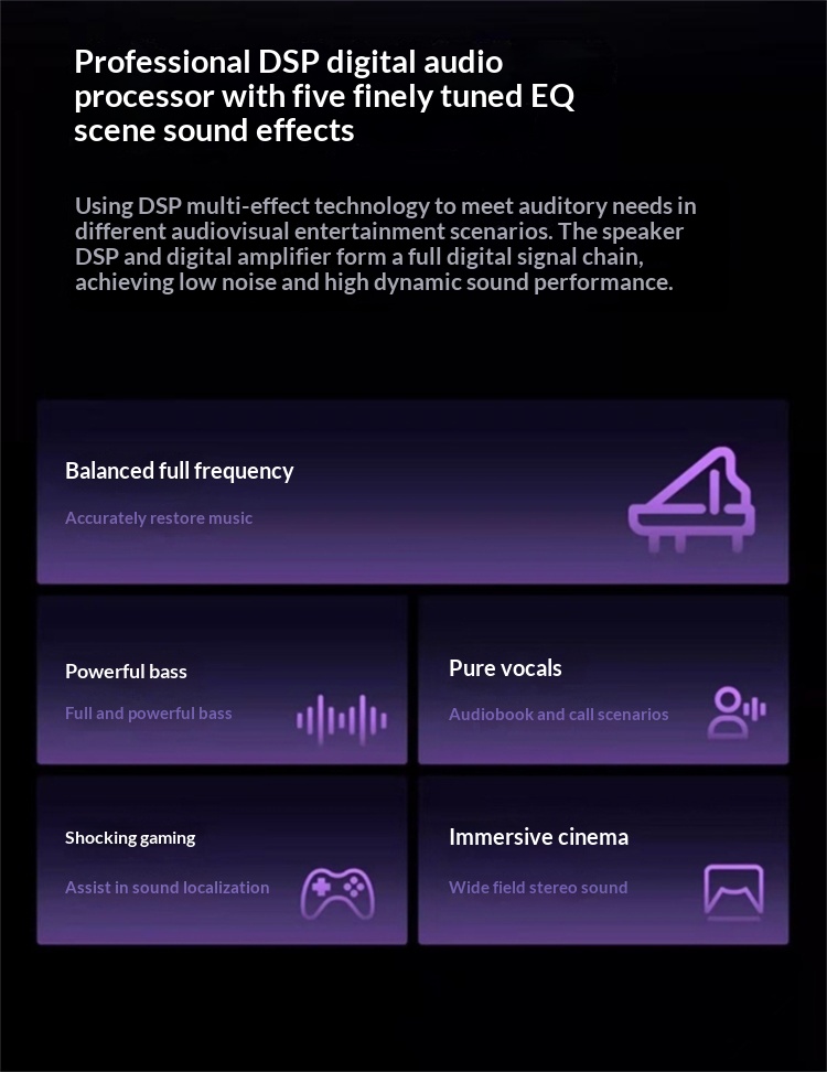 Featuring advanced DSP (Digital Signal Processing) technology, the soundbar provides five EQ presets tailored for diverse environments such as gaming, cinema, or music sessions. Enjoy enhanced depth, clean vocals, and warm bass tones for an expert-grade sound experience.