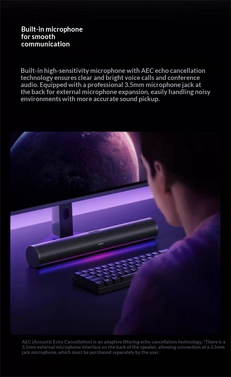 With a high-sensitivity microphone and AEC (Acoustic Echo Cancellation) technology, this soundbar ensures sharp, noise-free vocal output in calls and conference. Effortlessly connect via the 3.5mm mic jack for extended adaptability.