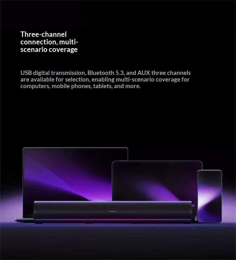 Offers versatile connection options including Bluetooth 5.3, USB, AUX inputs, and 3.5mm microphone ports. Ideal for integration with desktops, laptops, smartphones, and tablets, you can enjoy a multi-platform audio experience effortlessly.