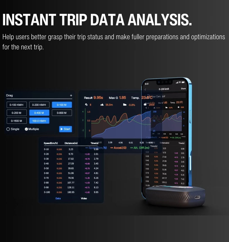 2. Comprehensive Performance Data Analysis: Capture and analyze your vehicle’s performance effortlessly with our smartphone-enabled app. This tool not only records full videos of your test sessions but also displays insightful data in an OSD (On-Screen Display). Review your session stats right after each run with unprecedented convenience and detail, reducing the reliance on cumbersome computer setups.