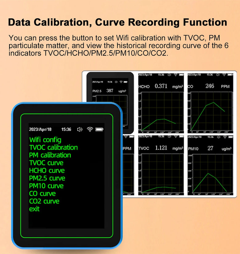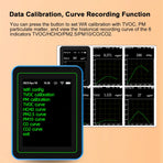 5. Curve Recording Function: Allows you to set WiFi calibration for TVOC and PM particulate matter, and view historical recording curves for six indicators (TVOC, HCHO, PM2.5, PM10, CO, CO2).