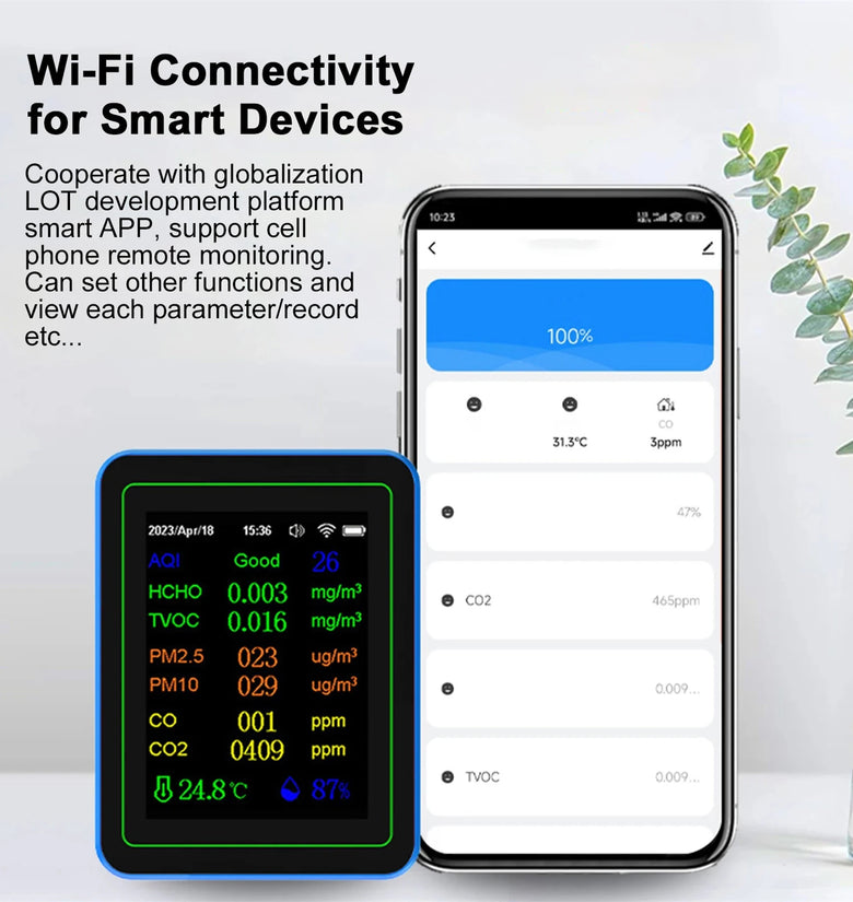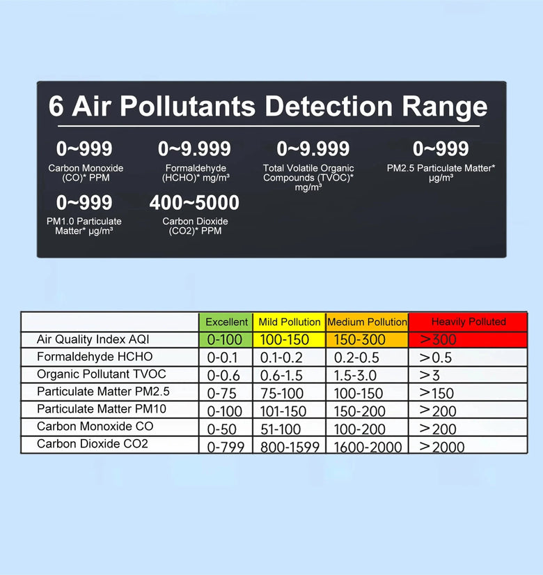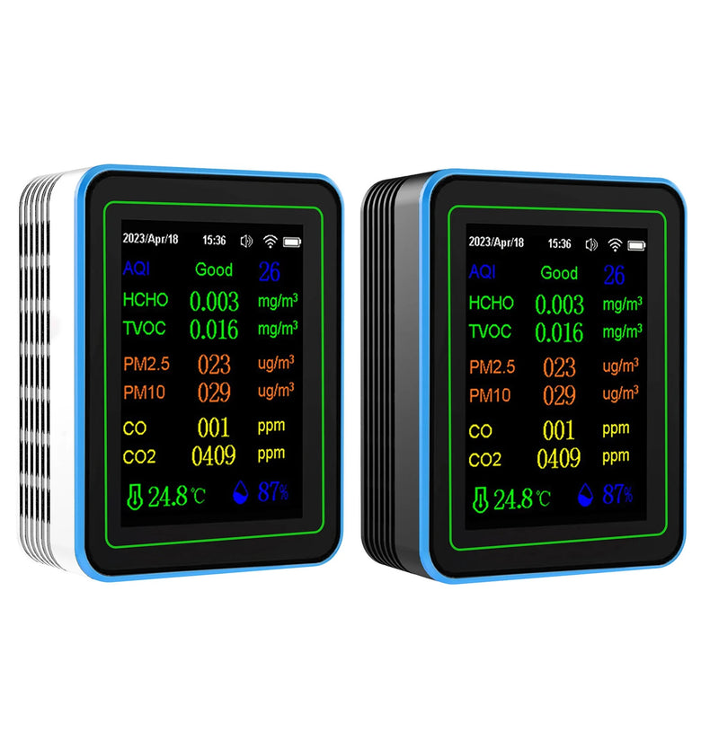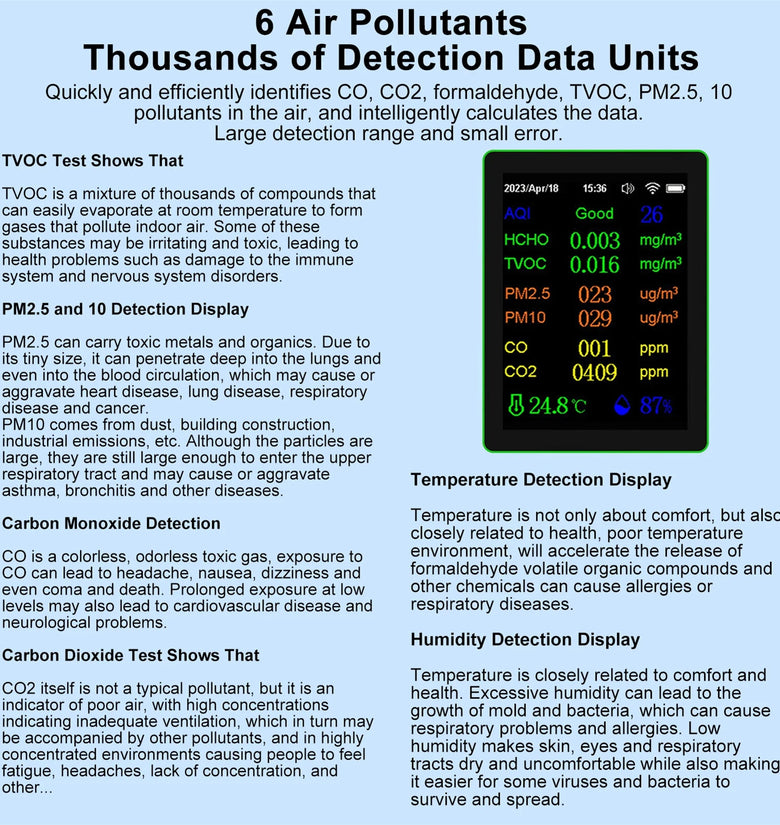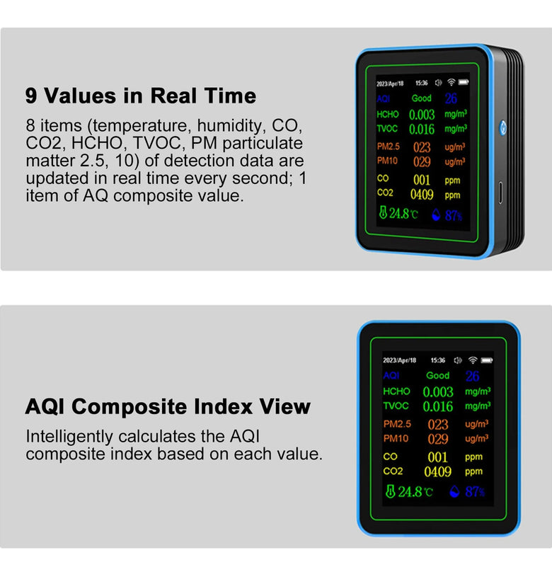 2. Comprehensive Monitoring: Capable of measuring various environmental factors such as AQI, HCHO, TVOC, PM2.5, PM10, CO, CO2, temperature, and humidity. The device provides a full assessment of your indoor air quality.